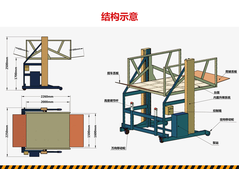 2. 液压系统:泵站、油缸,实现平稳升降,匹配不同车厢高度;部分手动液压款无需接电,电动款支持遥控;